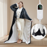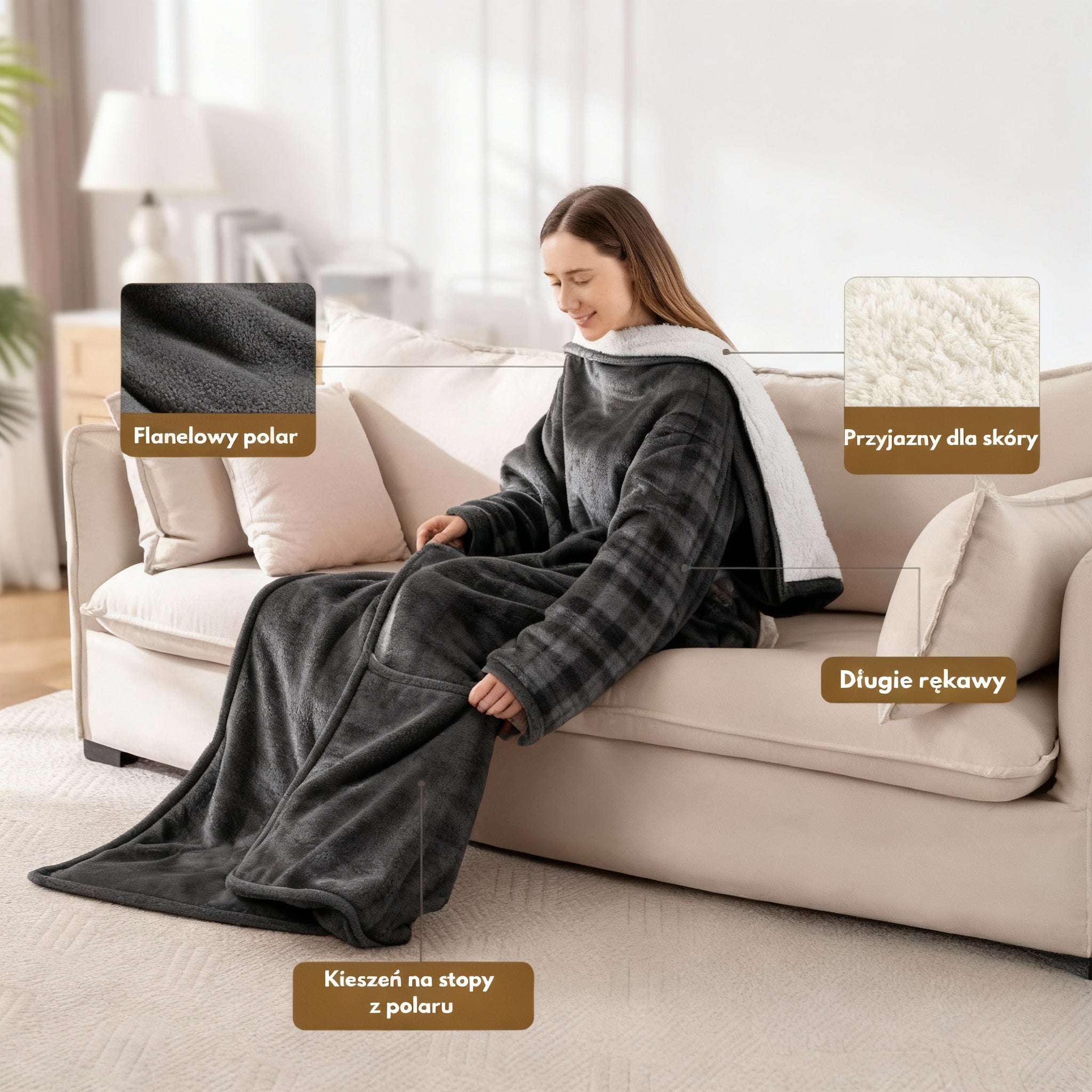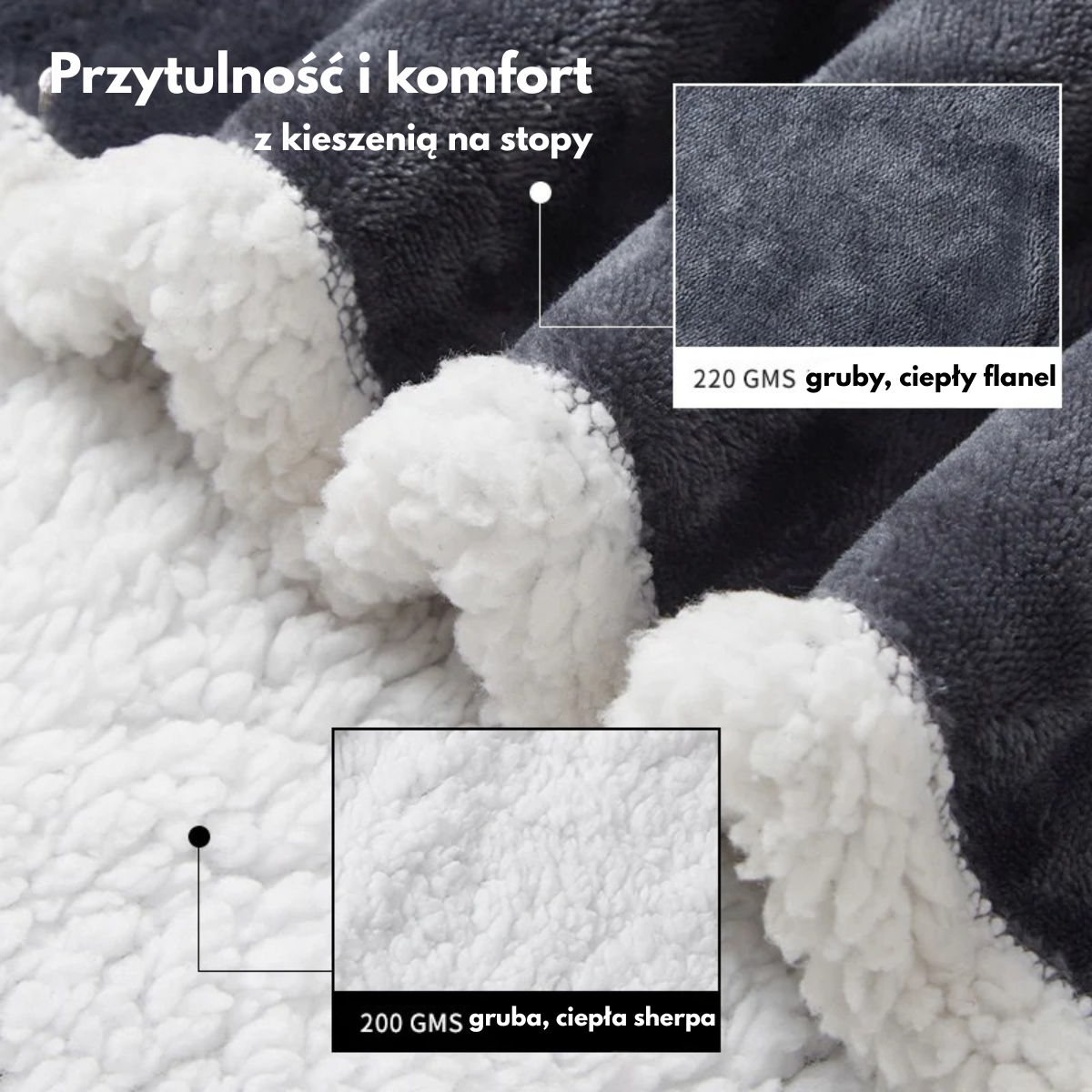 Wielofunkcyjny design: można nosić jak ponczo z rękawami i kieszenią na stopy lub rozłożyć jako duży koc (ok. 127×175 cm).